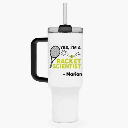 Cană termos cu mâner și pai personalizată cu text - Racket scientist
