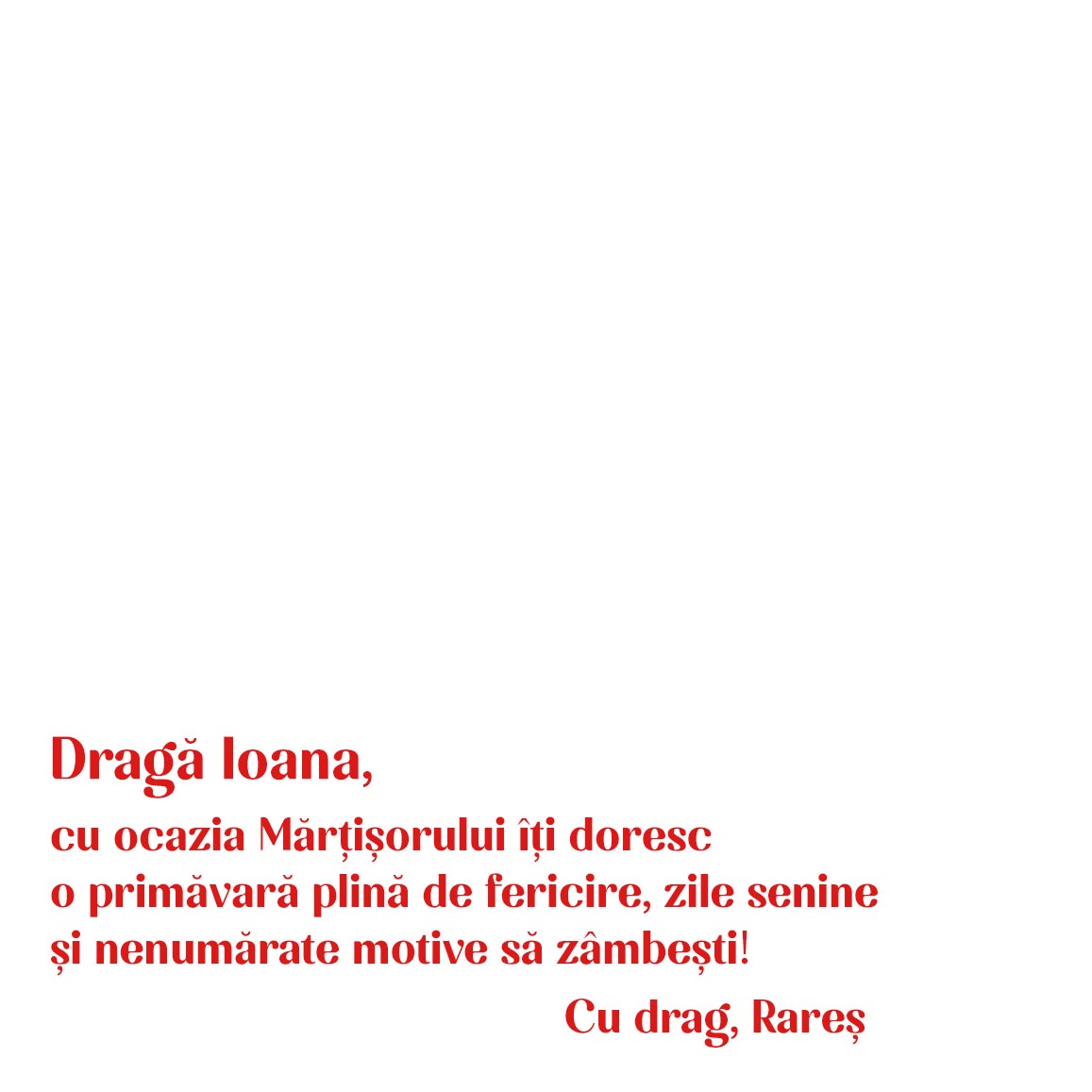 Surprinde persoanele dragi cu un card de Mărțișor personalizat, creat special pentru a transmite gânduri frumoase și urări sincere de primăvară. Ce pot personaliza? Cardul poate fi personalizat cu text Cum pot personaliza? Pasul 1: Apasă pe butonul "Personalizare" Pasul 2: Completează rândurile de text cu mesajul dorit, apoi apasă pe butonul "Confirmă" Pasul 3: Apasă butonul "Finalizare" și adaugă produsul în coș. Format - aprox. 9,8 x 9,8 cm Material: hârtie 250gr Dimensiune plic inclus: 13x13 cm