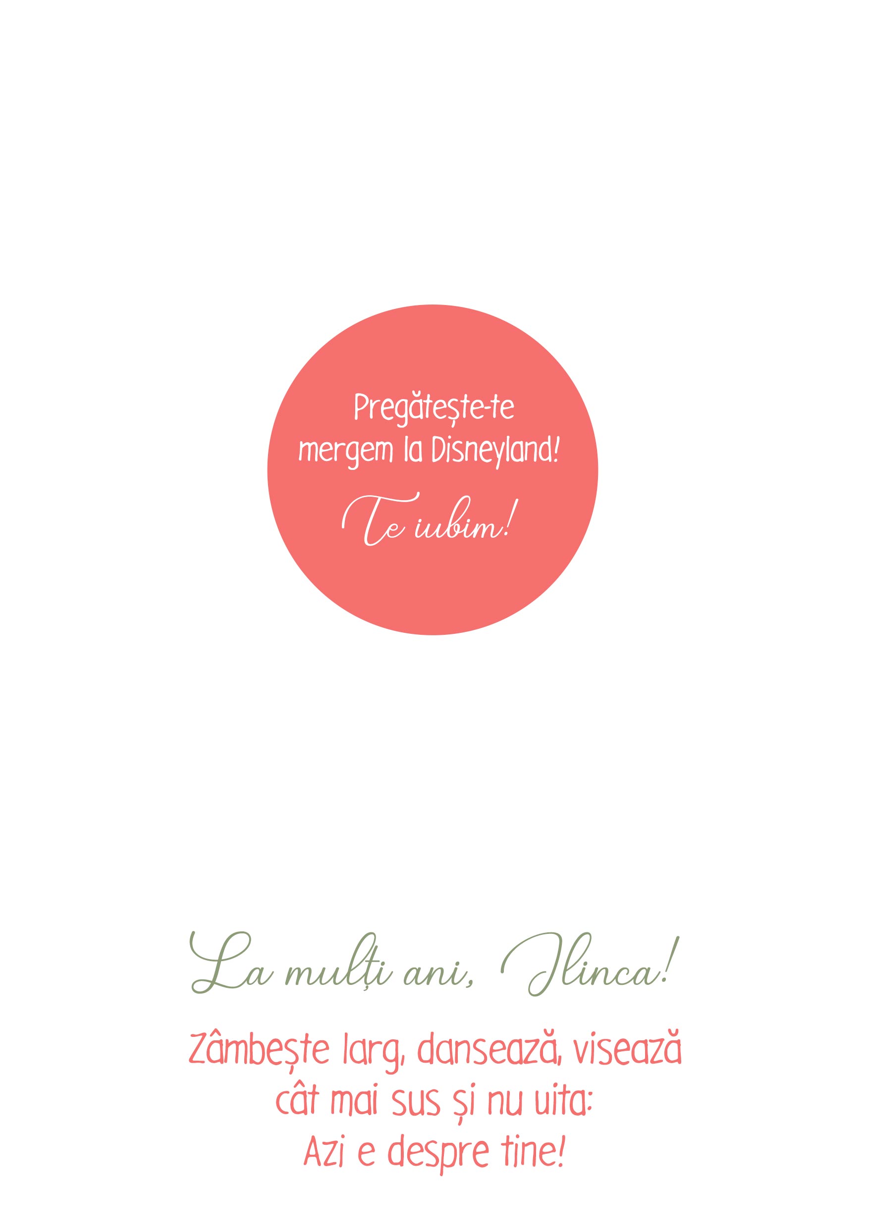 Cum pot face personalizarea? Pasul 1: Apasă pe butonul "Personalizare" Pasul 2: Completează câmpurile de text cu mesajul dorit, iar apoi apasă butonul "Confirmă" Pasul 3: Cum ai terminat personalizarea, apasă butonul "Finalizare" și adaugă produsul în coș. Format: (aprox. 13,5 cm X 19 cm)