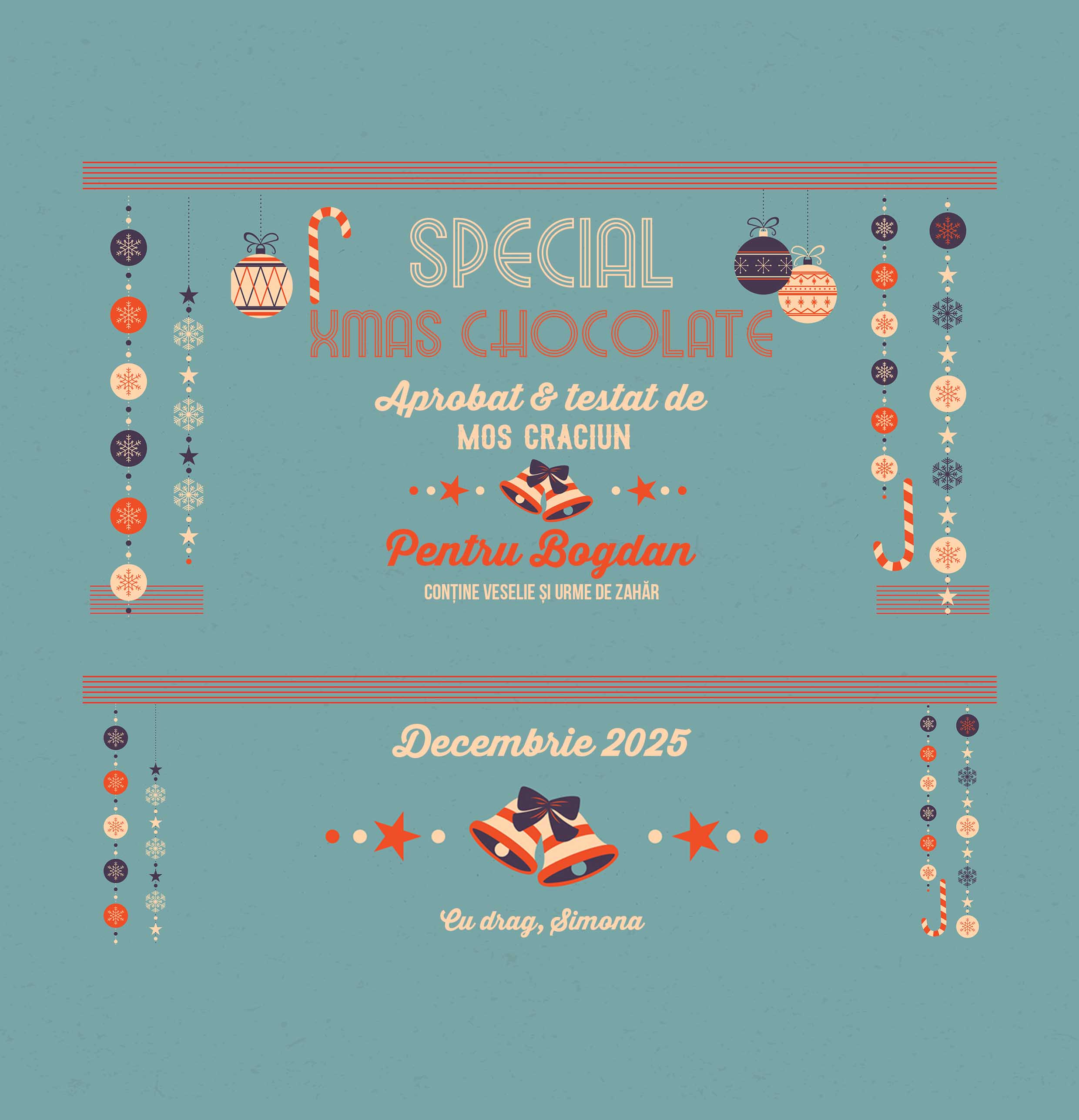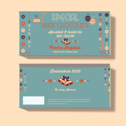 Pentru că magia Crăciunului începe cu un gest mic, dar plin de iubire – o ciocolată dulce, semnată chiar de Moș Crăciun! Ce pot personaliza? Ciocolata poate fi personalizată cu text.