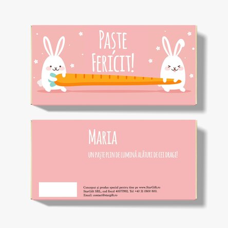 Și cum uneori rămânem în pană de idei, ne-am gândit că un mic cadou dulce nu ar strica nimănui! Îi poți scrie fie o urare simplă, specifică sărbătorilor pascale și apoi câteva gânduri de bine pentru tot anul. Ori dacă ai o relație mai apropiată cu persoana în cauză, poți merge puțin mai departe și să îi transmiți un mesaj haios care merge perfect cu iepurașii simpatici și ambalajul viu colorat de primăvară. Ce pot personaliza? Ciocolata poate fi personalizată cu text.