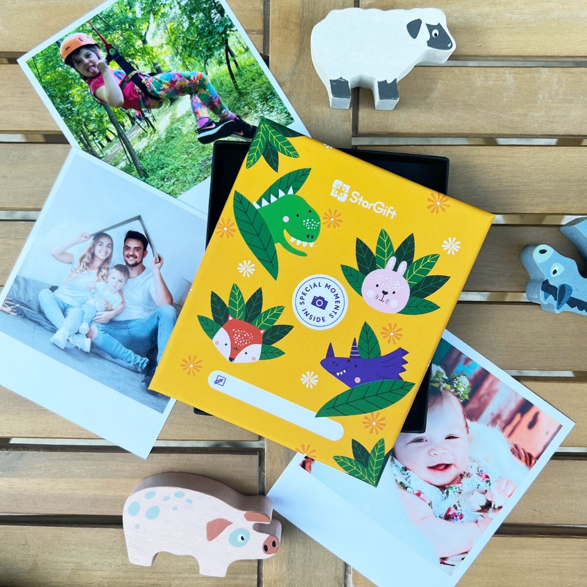 Surprinde-i pe cei mici cu un cadou inedit, pe care să îl aibă aproape și de care să își amintească mereu. Cutia cu amintiri este ideală când vrei să strângi toate amintirile într-un singur loc. Acum îți oferim posibilitatea să marchezi evenimentele importante din viața celor mici, alegând 32 de fotografii digitale, pe care noi le vom transforma în amintiri reale. Pozele vor fi împachetate într-o cutie simpatică, gândită special pentru aceștia, care cu siguranță va stârni curiozitate și va oferi emoție! În plus, tot tu poți decide și care va fi culoarea conturului pentru fiecare poză în parte și, mai mult decât atât, poți adăuga și un scurt text pe fiecare fotografie!
