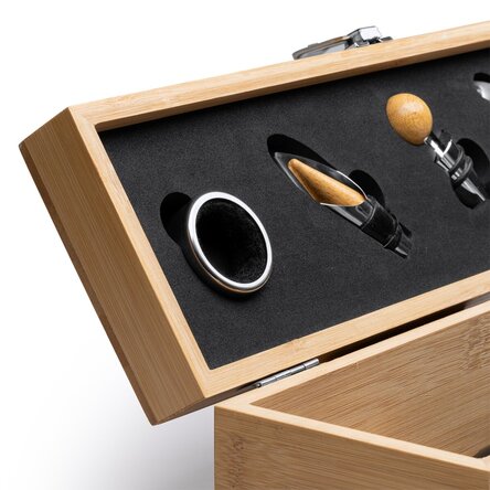 Setul este format din accesorii din oțel inoxidabil: tirbușon cu un dispozitiv de tăiere a capsulelor, un dozator, un dop și un inel de picurare. Aceste elemente oferă toate instrumentele necesare pentru a deschide cu ușurință și a vă