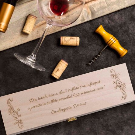 Fie că ai fost invitat la o cină specială, sau că este vorba de o aniversare, o onomastică sau de o petrecere la birou, o cutie de vin personalizată va da un plus de valoare cadoului pe care îl faci. Poți alege orice mesaj dorești, iar el va fi gravat pe o cutie specială, din lemn natural, chiar în atelierele StarGift. În plus, tot noi te putem ajuta și cu vinul, iar acum ai posibilitatea de a personaliza inclusiv eticheta sticlei pe care o alegi.