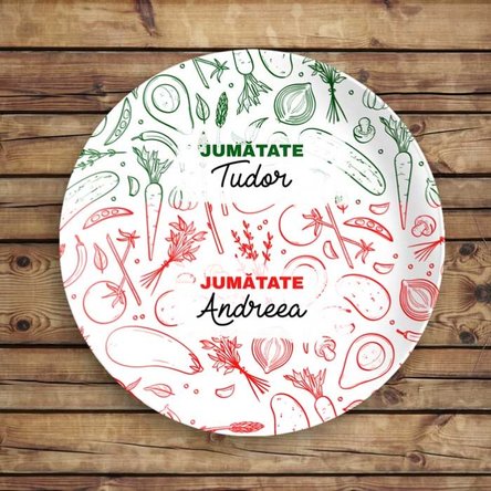 Dacă vrei să oferi un plus decorativ mesei, poți opta pentru o farfurie personalizată cu text, perfectă pentru a inaugura momentul special din viața ta!