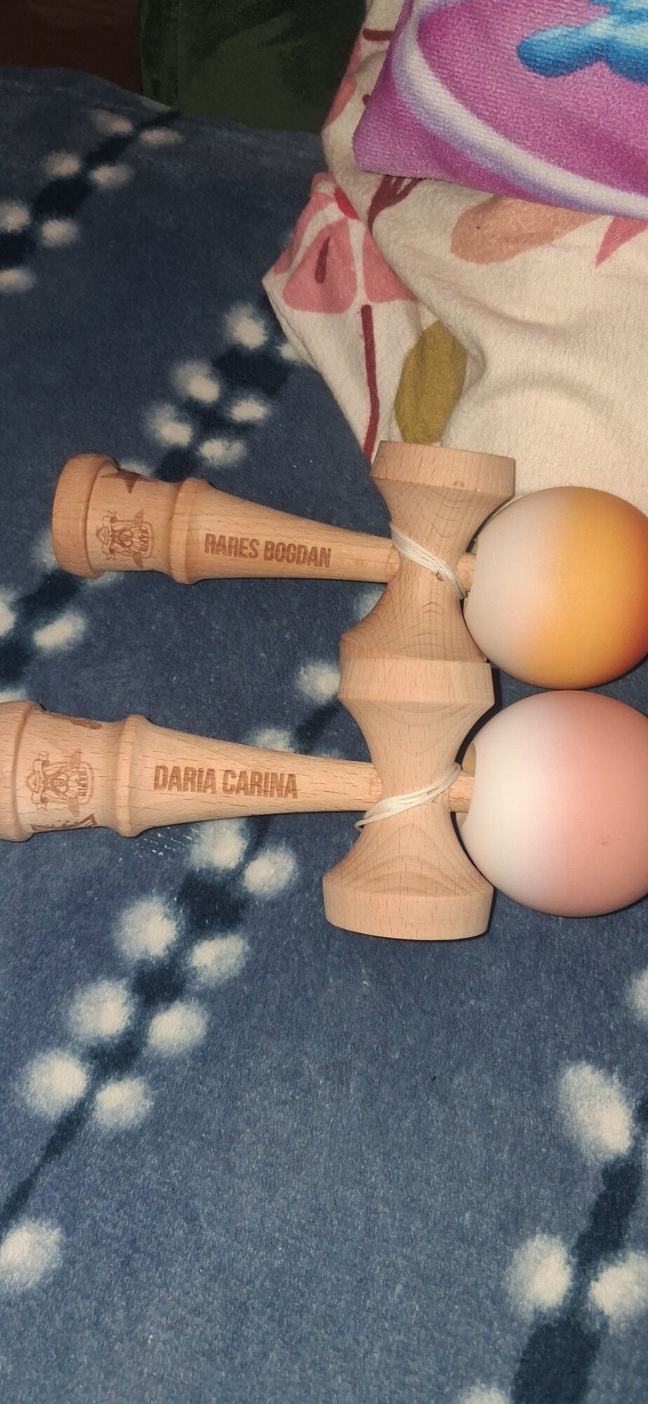 Ce pot personaliza? Kendama poate fi personalizată cu text.