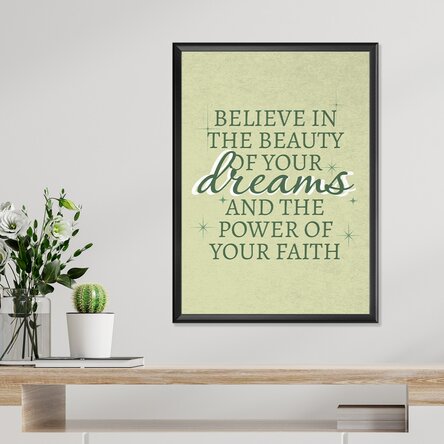Un poster delicat și inspirațional care combină eleganța tipografiei clasice cu accente sclipitoare pentru a transmite un mesaj profund: frumusețea visurilor tale merită încrederea ta, iar credința îți dă puterea să le atingi. Fundalul pastelat verde oferă o senzație calmă și pozitivă, perfectă pentru spații în care vrei să aduci speranță, motivație și visare.