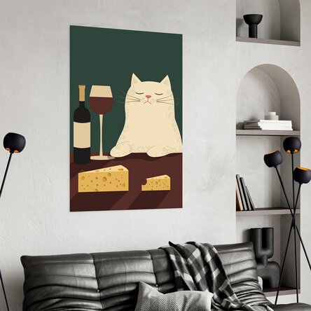 Un poster decorativ cu o ilustrație simpatică sau artistică ce surprinde o pisică relaxată lângă un pahar de vin și o farfurie cu brânzeturi fine. Este perfect pentru bucătărie, living sau colțul tău preferat de relaxare. Atmosfera pe care o transmite? Calm, umor fin și plăcerea lucrurilor simple.