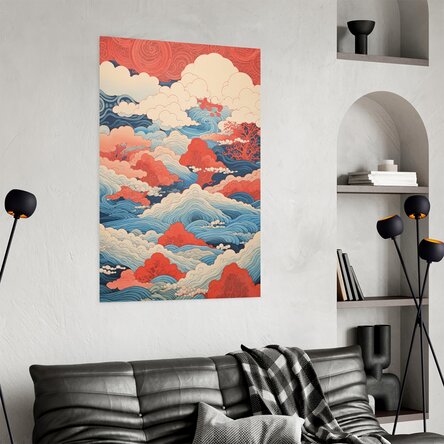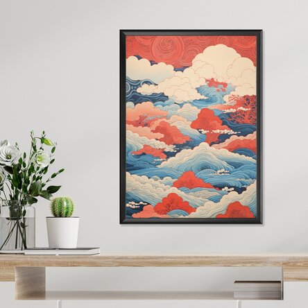 Un poster care surprinde esența esteticii japoneze printr-un dans vizual între valurile albastre ale mării și norii roșii ai cerului. Inspirată din gravurile tradiționale ukiyo-e, această ilustrație combină dinamismul apelor cu liniștea norilor, creând un echilibru vizual între mișcare și calm. Culorile contrastante – albastru profund și roșu vibrant – evocă energia celor două elemente fundamentale, într-o compoziție artistică ce atrage privirea și îmbogățește orice ambient. Ideal pentru decorul unui living modern, birou creativ sau colț de meditație.