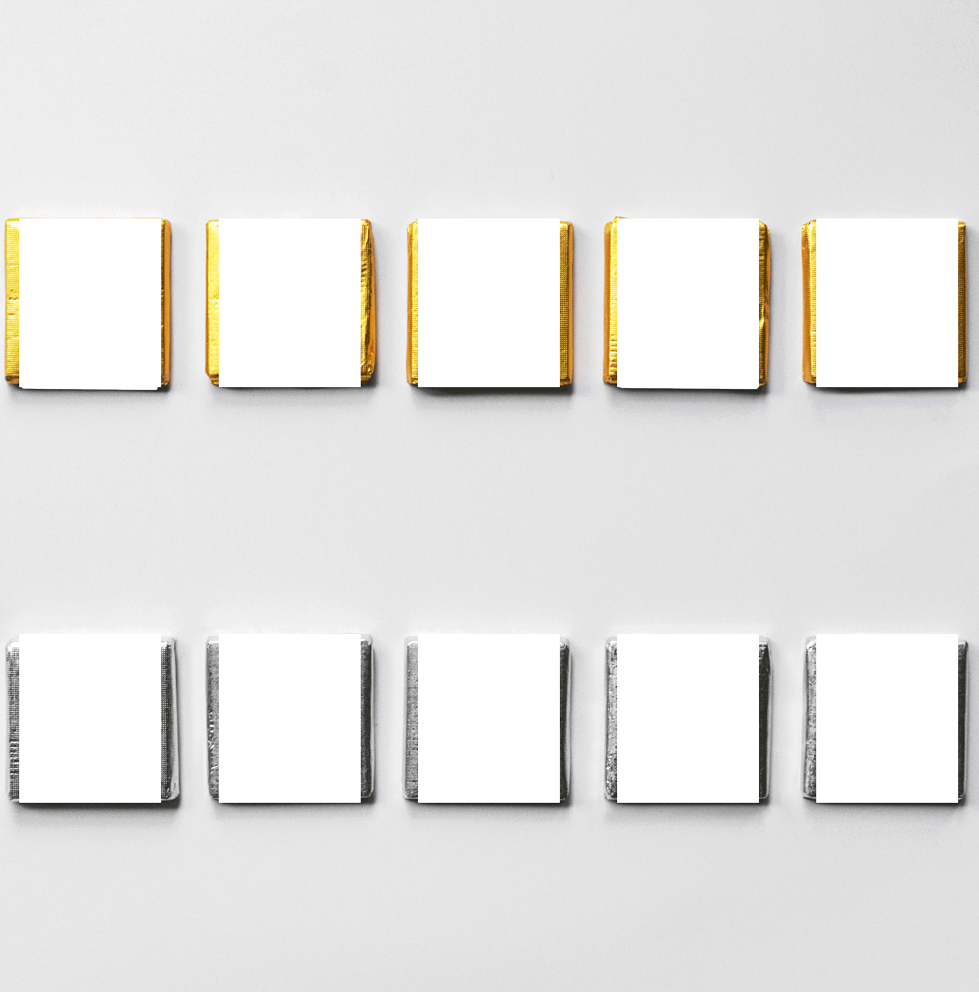 Notă: Culoarea staniolului nu se poate alege și poate fi diferită față de culoarea prezentată cu titlu informativ în zona de previzualizare. Setul de 10 mini ciocolățele vine în săculeț organza.