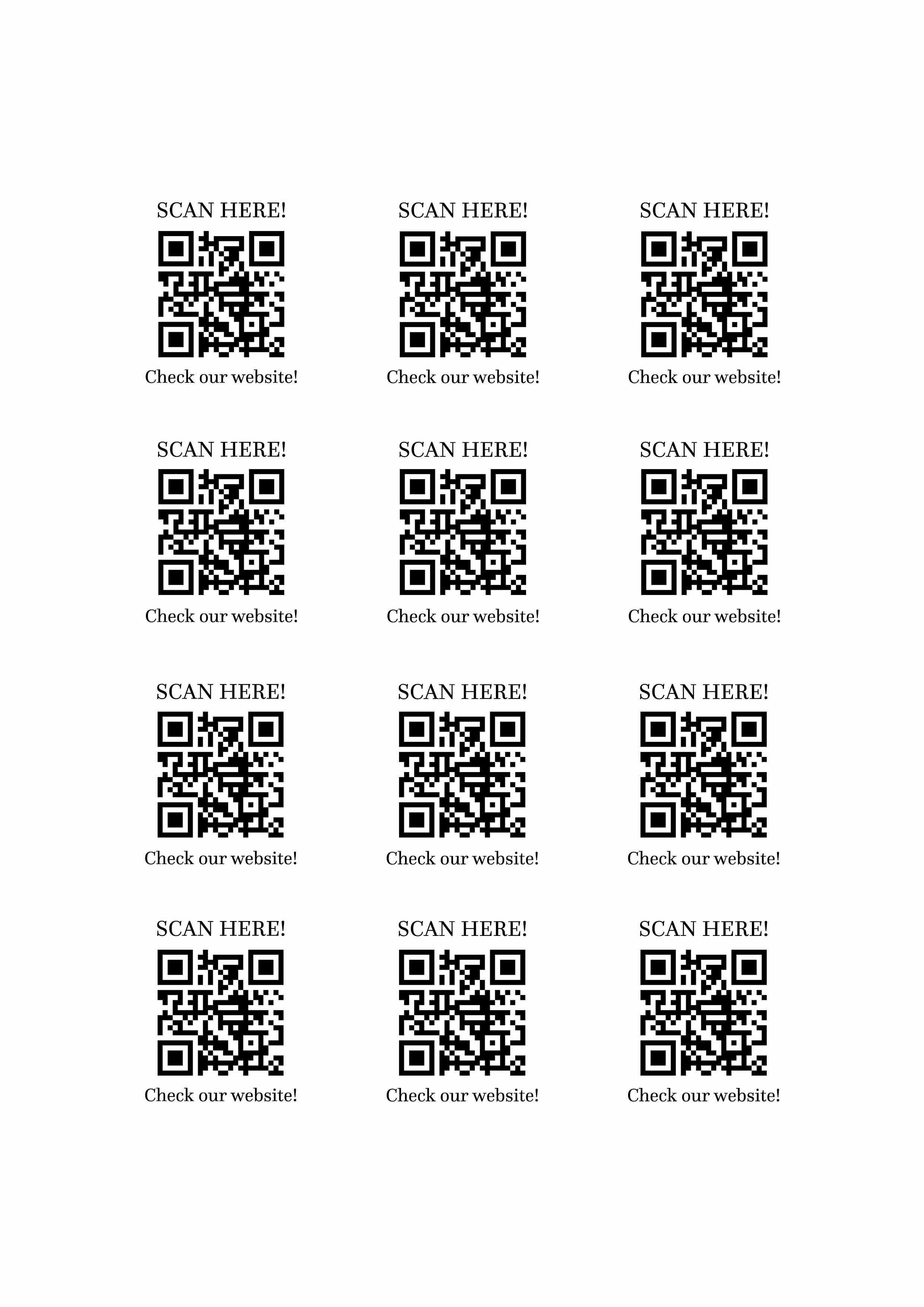Atrage atenția clienților tăi și direcționează-i rapid către site-ul tău cu aceste stickere moderne și practice! Fiecare sticker conține cod QR (cu link-ul dorit) și textul personalizat „Check our website”, ideal pentru promovarea online a afacerii tale.
