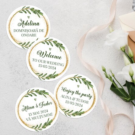Transformă fiecare detaliu al nunții tale într-o expresie a personalității voastre cu ajutorul stickerelor personalizate. Aceste mici accesorii elegante nu doar că adaugă un plus de rafinament plicurilor de mulțumire, dar și transmit un mesaj de recunoștință într-un mod unic. Stickerele personalizate sunt versatile și pot fi utilizate în diverse moduri – de la sigilarea plicurilor de mulțumire trimise invitaților, până la decorarea cutiilor de mărturii sau a altor elemente de papetărie.