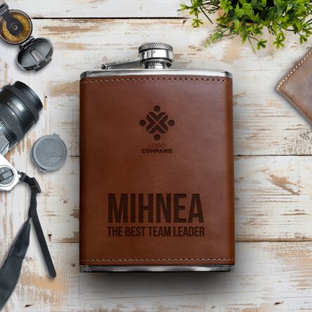 Sticlă de buzunar îmbrăcată în piele personalizată cu logo și nume