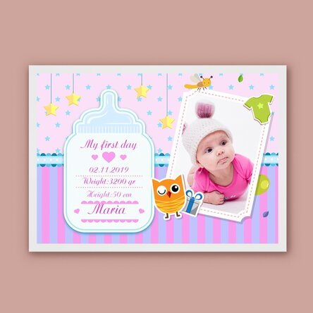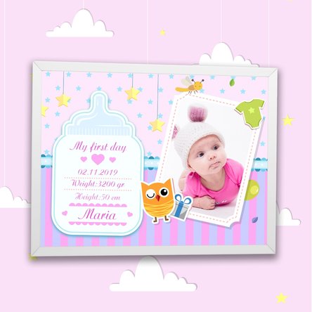 Părinții care doresc să păstreze în camera copilului una din cele mai dragi imagini din viața lor, atunci când o viață a luat naștere din iubirea lor, pot personaliza acest tablou cu data nașterii, greutatea micuței, înălțimea și numele ei și cele mai dragi fotografii. Ce pot personaliza? Printul poate fi personalizat cu fotografii si text.